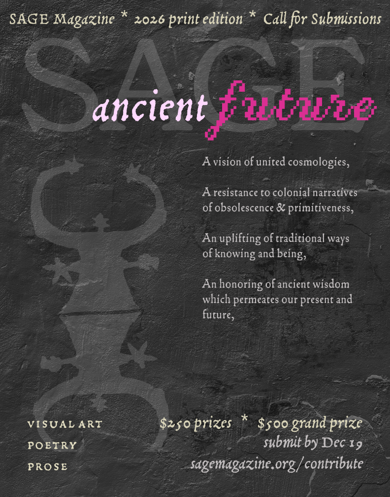 SAGE Magazine seeks any combination of provocative, critical, beautiful, captivating work from emerging and established environmental writers and artists. We welcome pieces ranging from playful to pensive. Our throughline is to strengthen and explore the relationship between humanity and the environment.